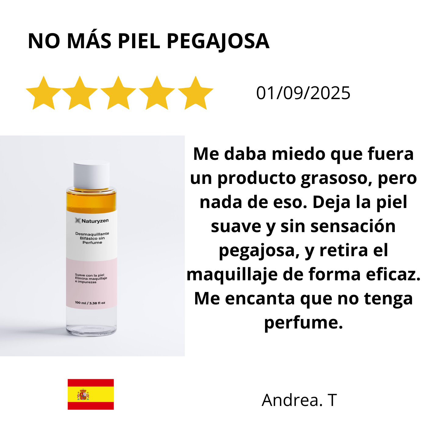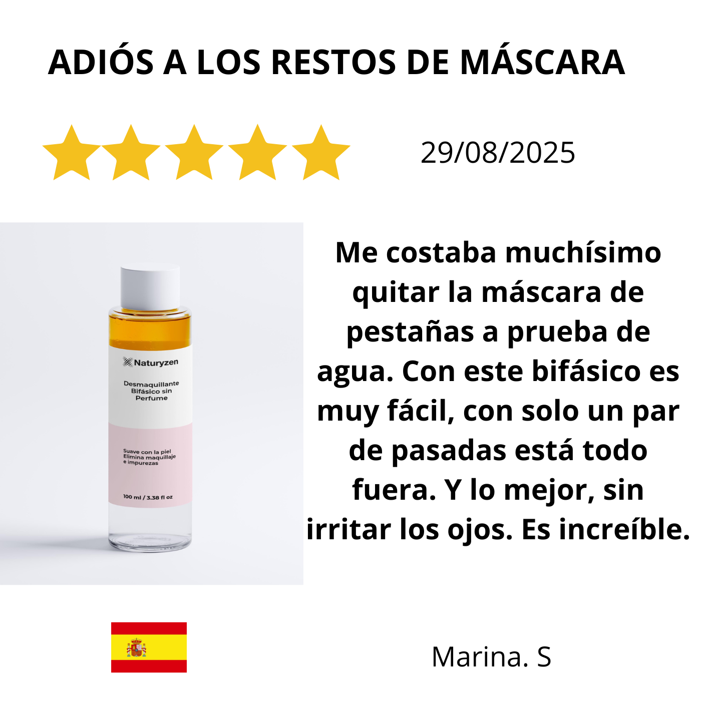 No todas las pieles aceptan los perfumes, y no pasa nada. Por eso hemos creado este desmaquillante bifásico, sin aroma, que elimina hasta el maquillaje más resistente sin irritar ni un poquito. Es una limpieza profunda, pero respetuosa, que te regala una sensación de frescura y alivio al final del día.