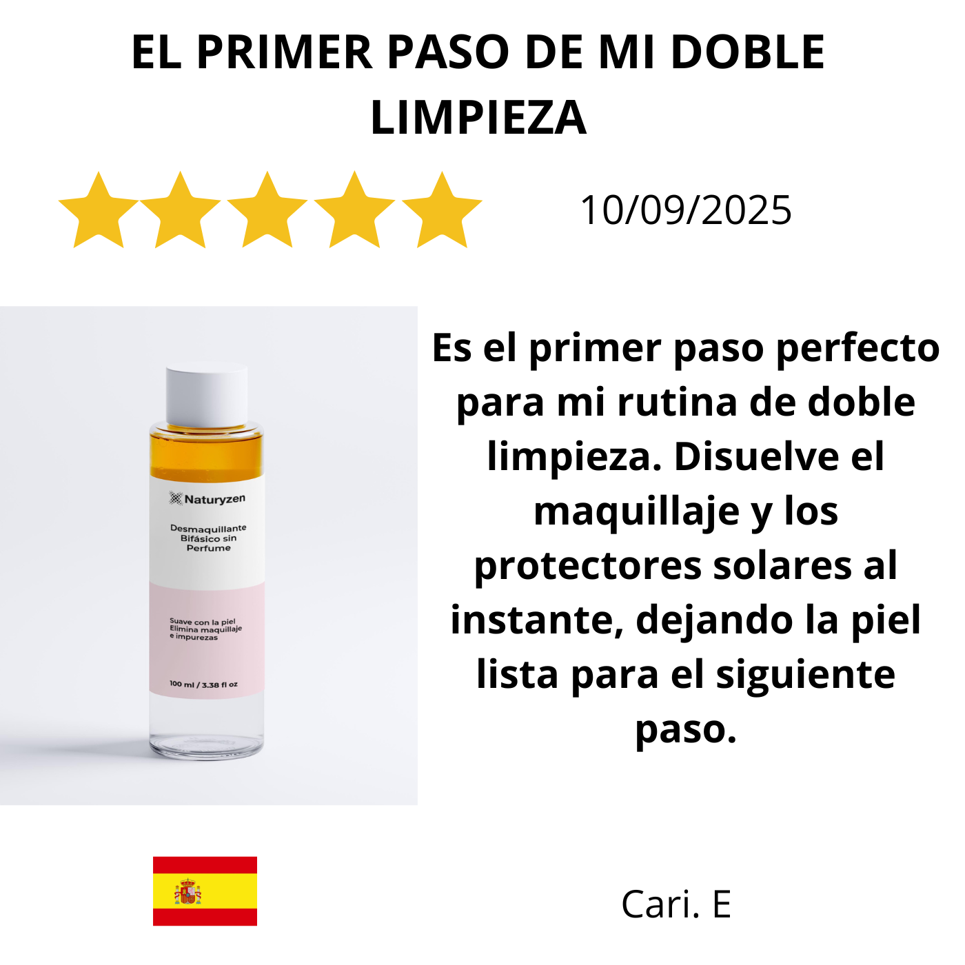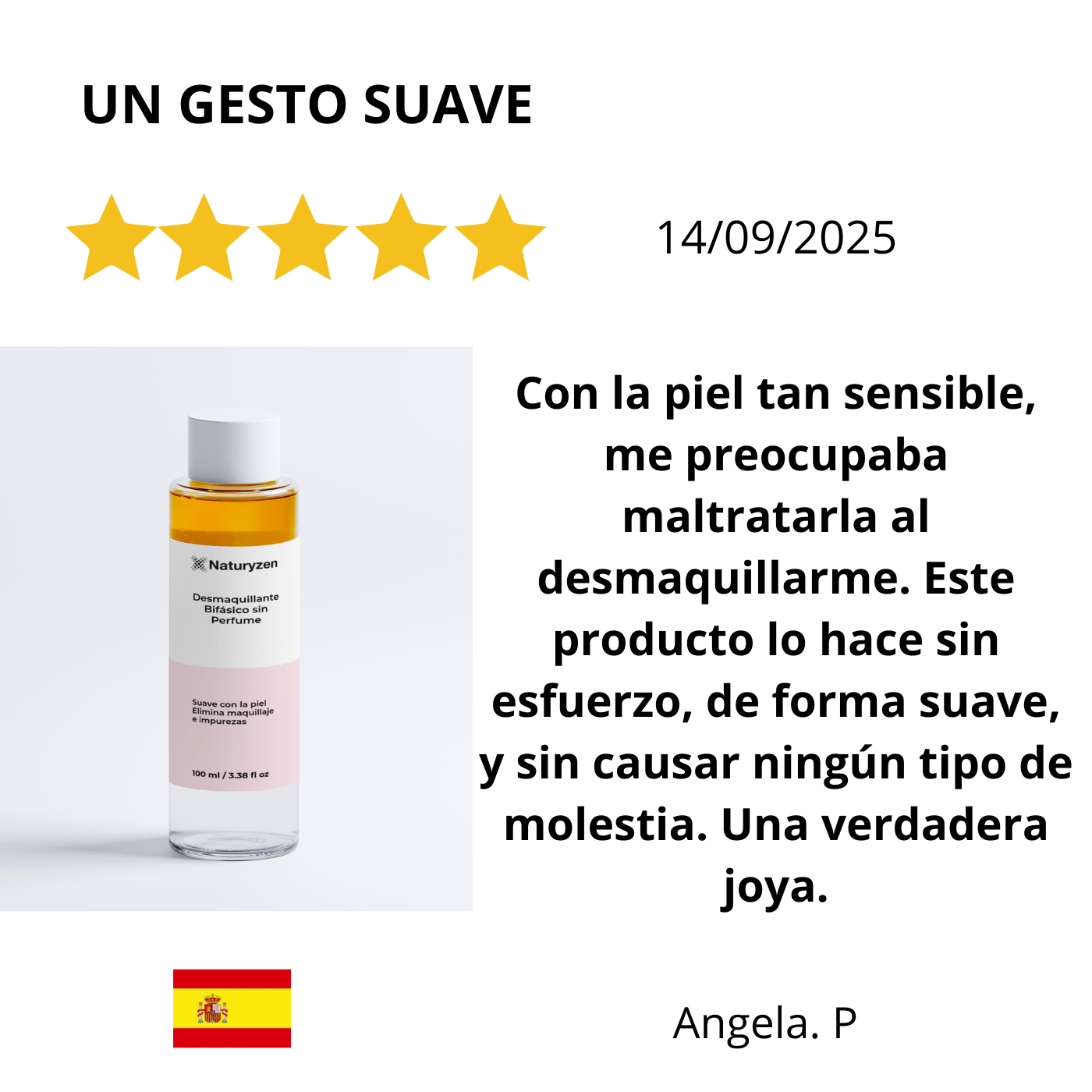 En Naturyzen no creemos en la lucha, creemos en el cuidado. Este desmaquillante es la prueba de ello. Al mezclar sus dos fases, una acuosa y otra oleosa, se crea la fórmula perfecta para disolver cualquier rastro de maquillaje sin necesidad de frotar ni agredir. Es un gesto de amor hacia tu piel que te permite retirarlo todo, incluso el rímel más tenaz, de forma sencilla y sin esfuerzo.