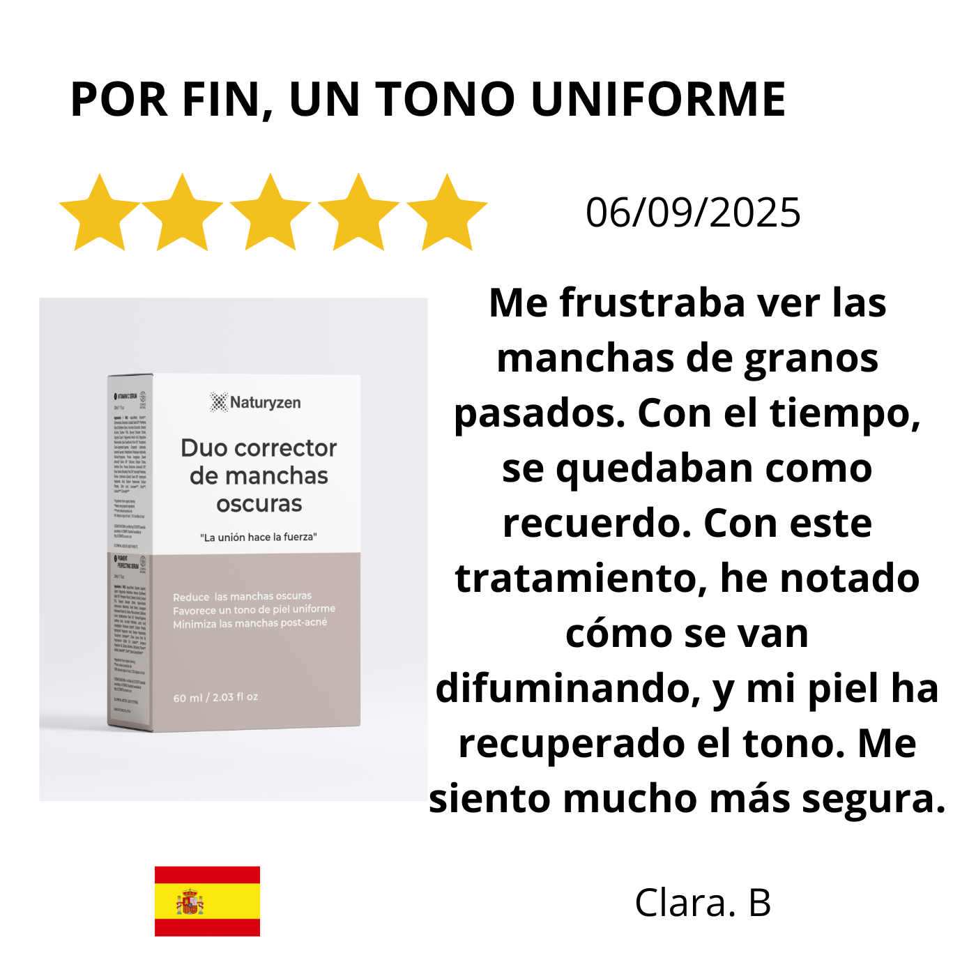 Mírate. El esfuerzo ha merecido la pena. Tu piel está más luminosa, con un tono uniforme y sin rastro de esas manchas que te preocupaban. La confianza en ti misma ha vuelto para quedarse, y tu piel te acompaña en cada momento, radiante y saludable.