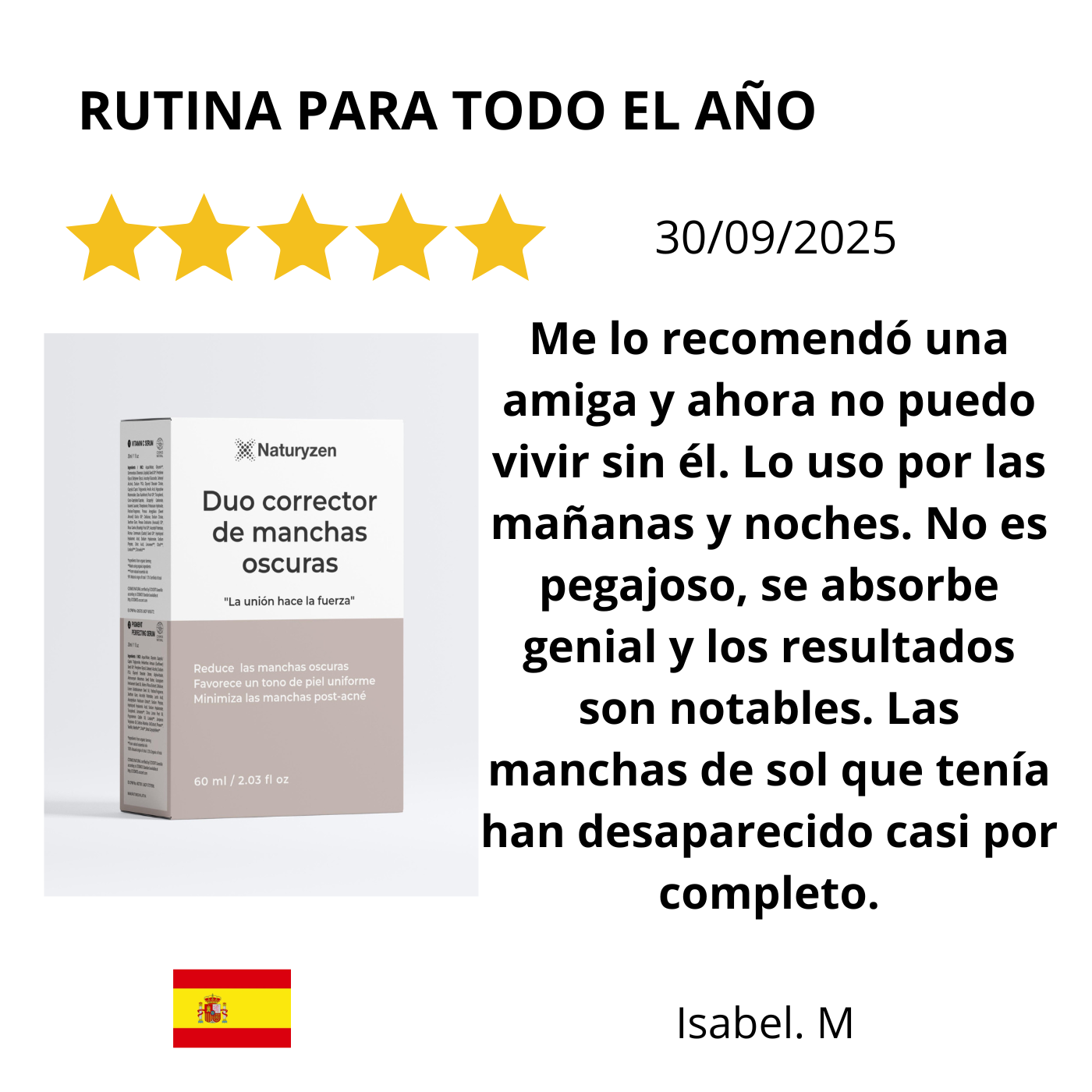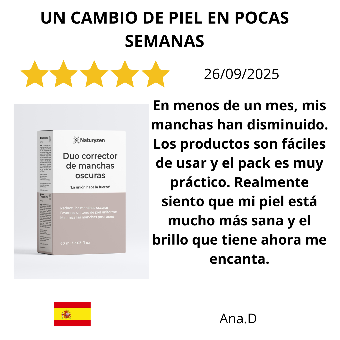 En Naturyzen, entendemos que las manchas no son todas iguales. Por eso, nuestro enfoque es claro y directo. No importa si son de la edad, del sol, o si quedaron como recuerdo de un brote de acné, nuestro método está diseñado para devolverle a tu piel la uniformidad que buscas.