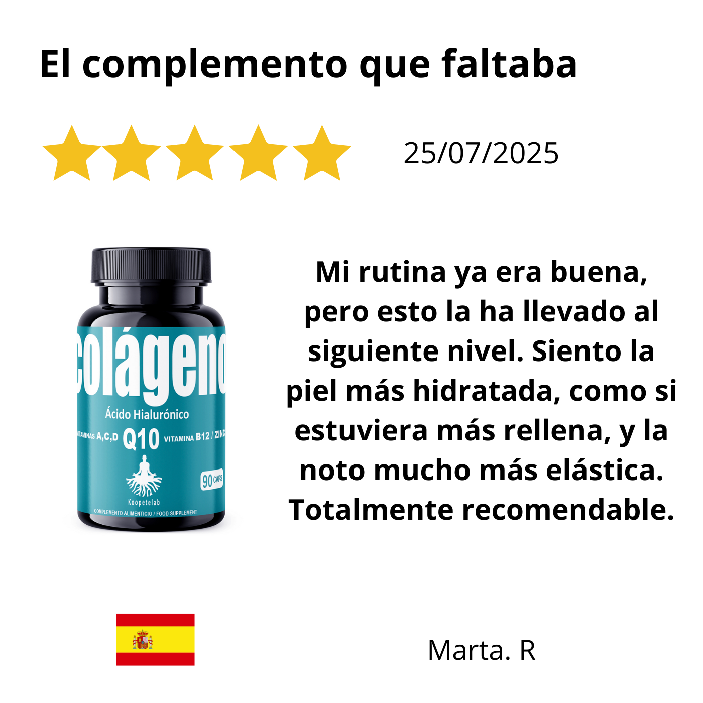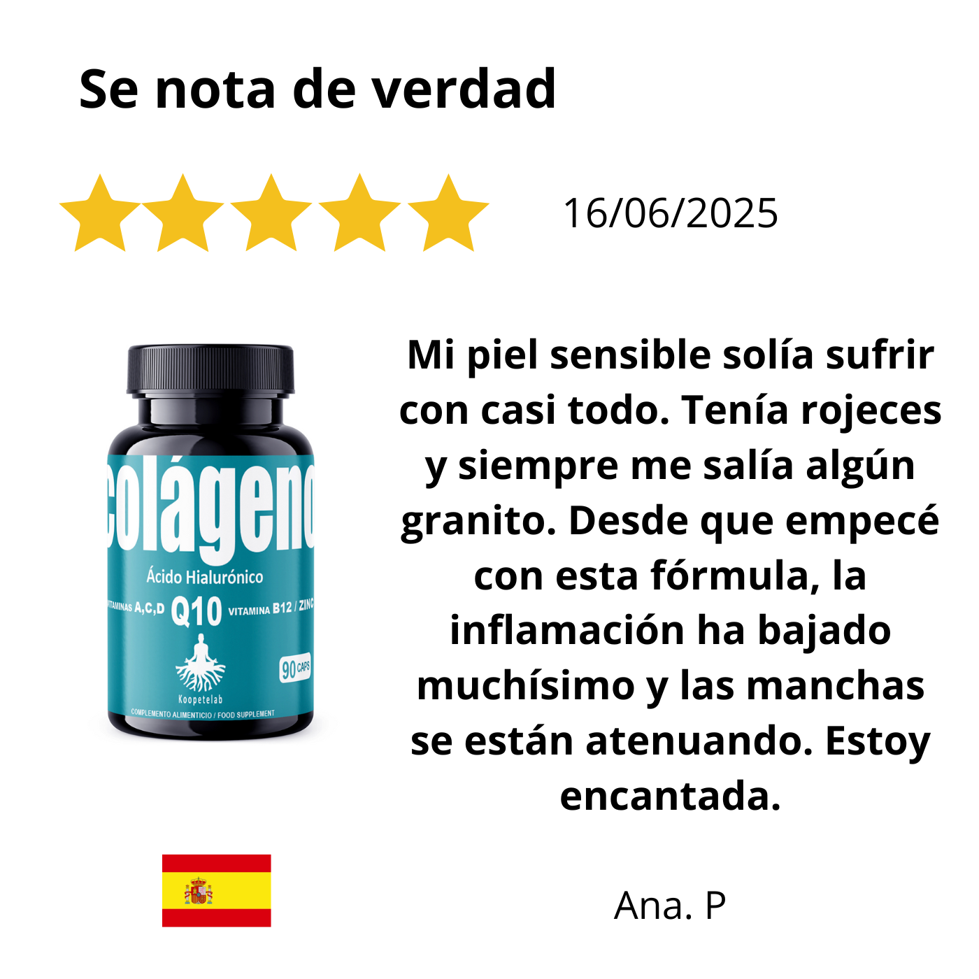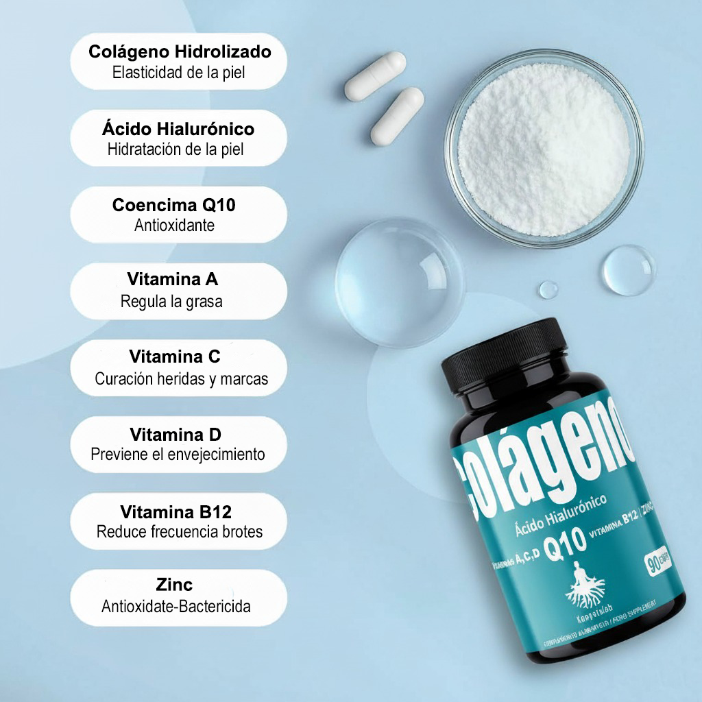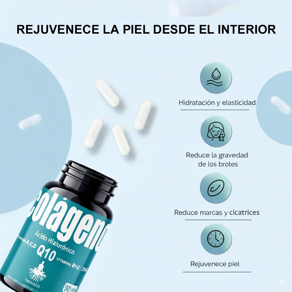 Al tomar este suplemento, sentirás una vitalidad renovada en tu rostro. Notarás que tu piel adquiere una textura de terciopelo y una "jugosidad" que quizás habías perdido por el estrés o el cansancio diario. Sentirás la satisfacción de estar blindando tu juventud, percibiendo cómo tu rostro se mantiene terso y "lleno", previniendo que las líneas de expresión se marquen antes de tiempo gracias al soporte estructural del colágeno y la energía celular de la Q10.