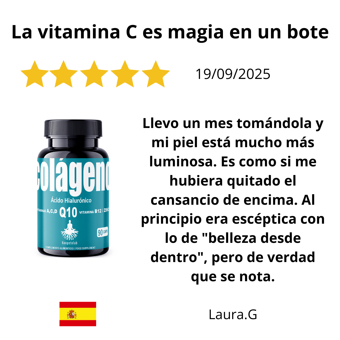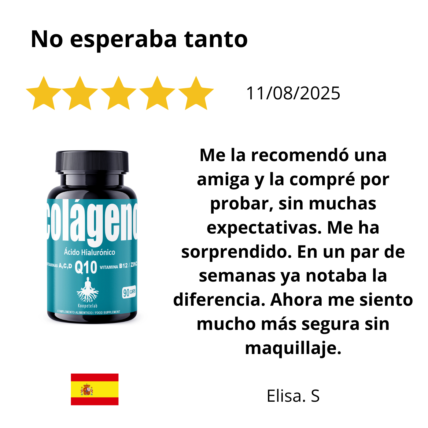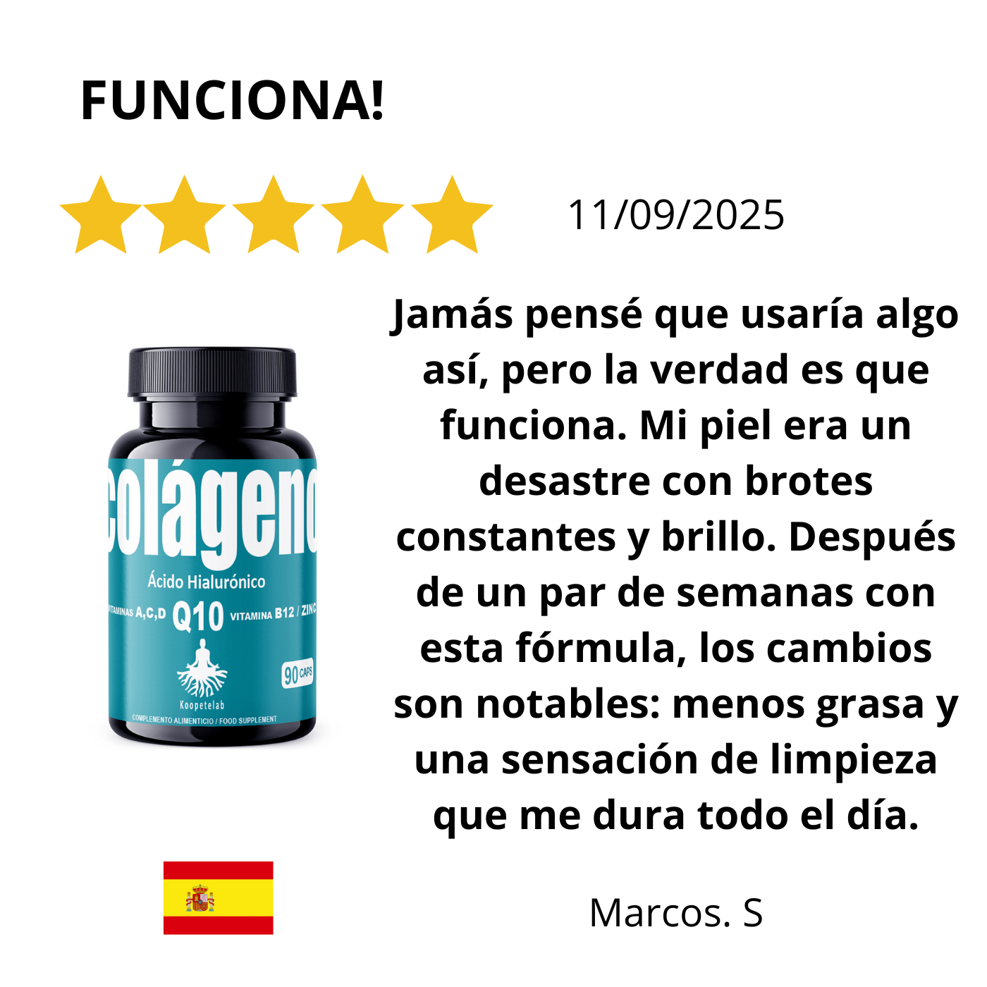 Al tomar este suplemento, sentirás una vitalidad renovada en tu rostro. Notarás que tu piel adquiere una textura de terciopelo y una "jugosidad" que quizás habías perdido por el estrés o el cansancio diario. Sentirás la satisfacción de estar blindando tu juventud, percibiendo cómo tu rostro se mantiene terso y "lleno", previniendo que las líneas de expresión se marquen antes de tiempo gracias al soporte estructural del colágeno y la energía celular de la Q10.