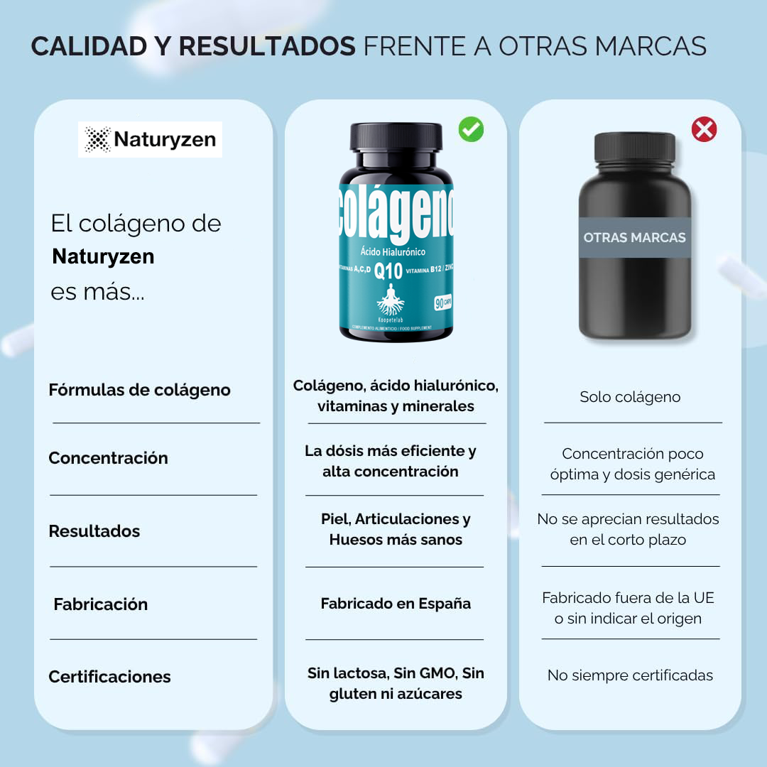 LA FORMULA MÁS COMPLETA.MÁXIMA EFICACIA. Colágeno hidrolizado. + 7 activos que multiplican su efecto: Coencima Q10, Ácido Hialurónico, Vitamina C, Vitamina D, Vitamina A, Vitamina B12, Zinc, Dióxido de silicio, Estearato de magnesio, Maltodextrina