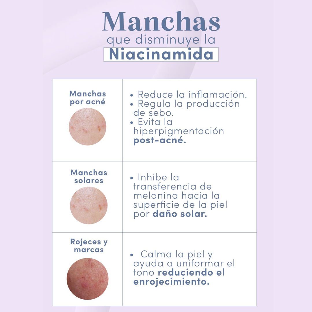 Niacinamida: Es la vitamina B3, una aliada multi-tarea. Es como esa amiga que siempre está ahí para todo: ayuda a la piel a retener la hidratación para que se sienta más suave y también trabaja para que esas manchitas y el tono desigual se vean menos notorios. Es la encargada de que tu piel recupere su brillo natural y se vea más uniforme.