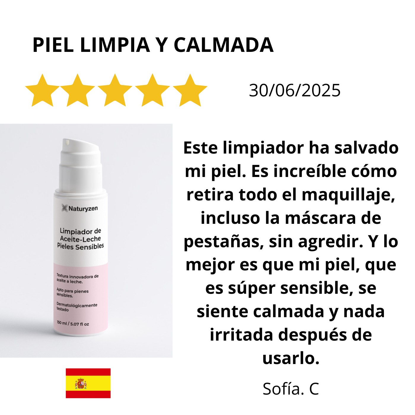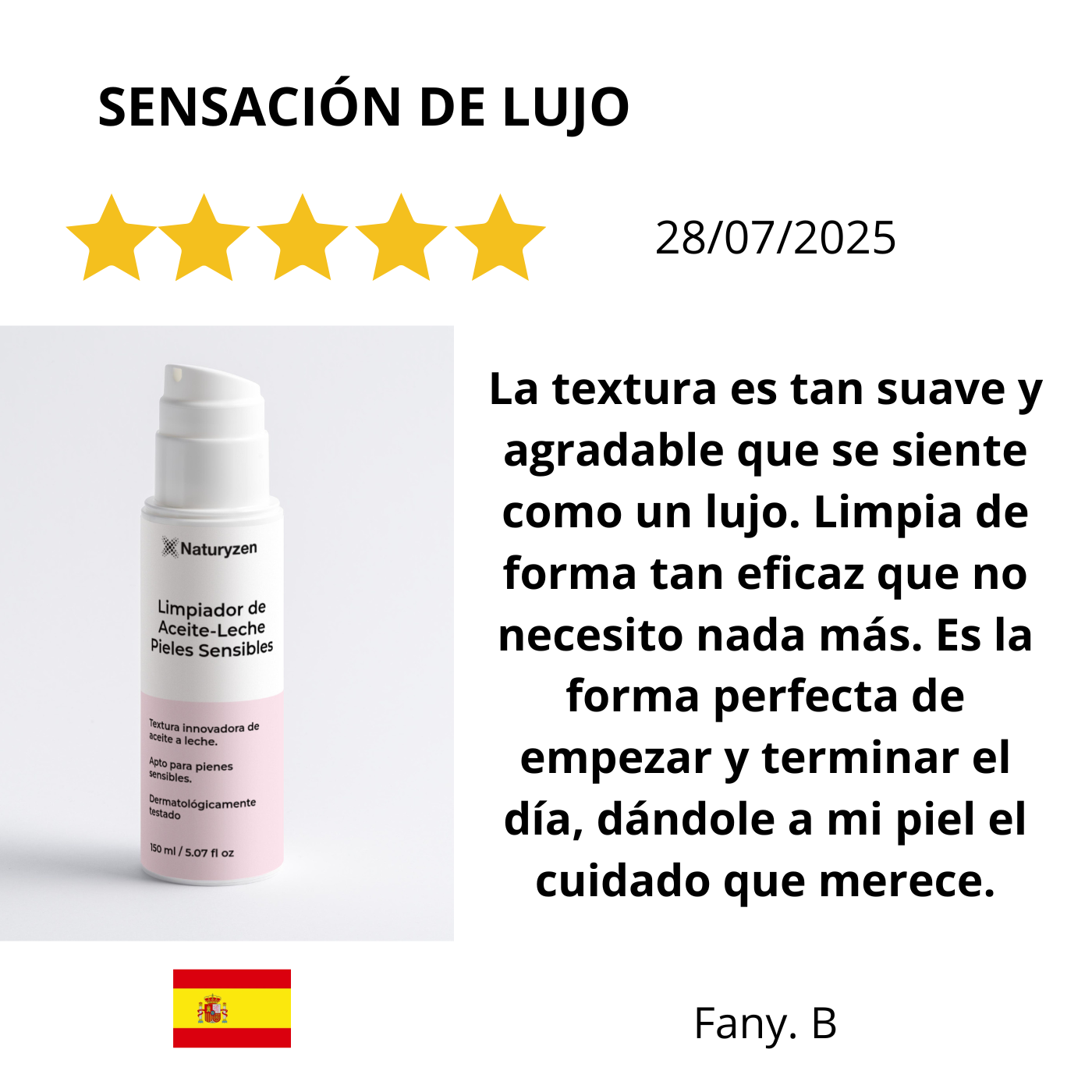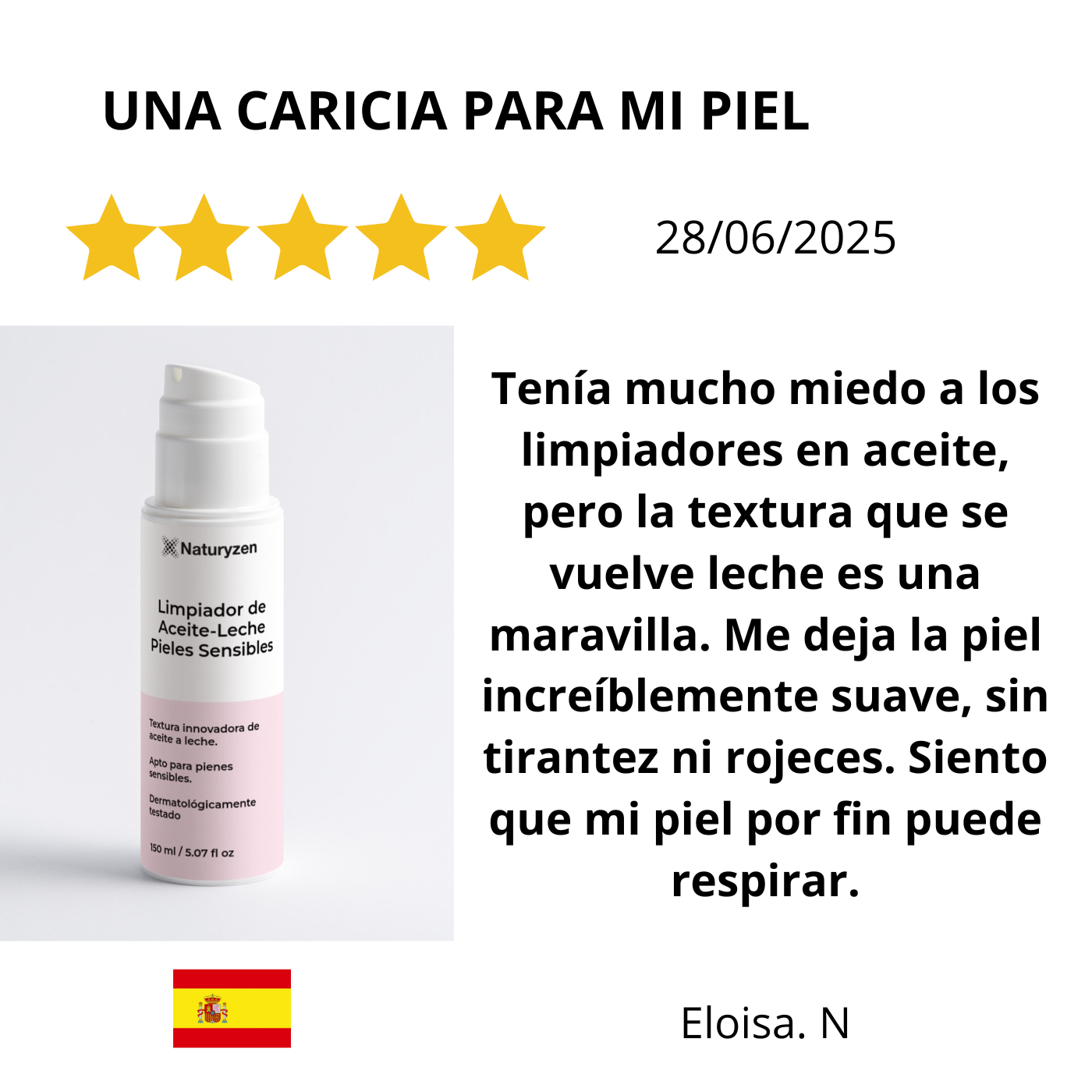 Este limpiador no es como otros. Es un aceite que, al contacto con el agua, se convierte en una leche sedosa, limpiando tu piel con una delicadeza que nunca habías sentido. Retira impurezas y maquillaje sin agredir ni resecar, dejando una sensación de confort absoluto. Es el cuidado que tu piel sensible ha estado pidiendo