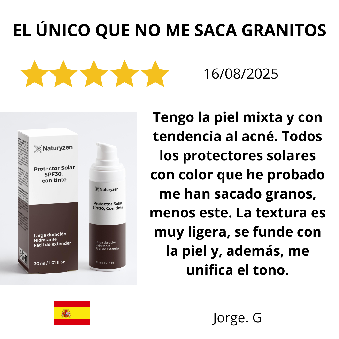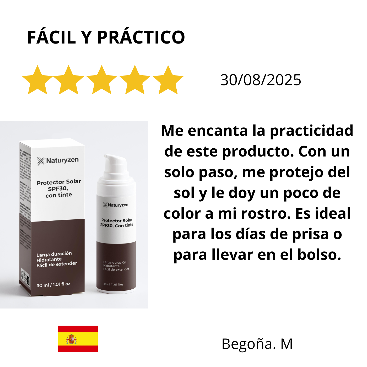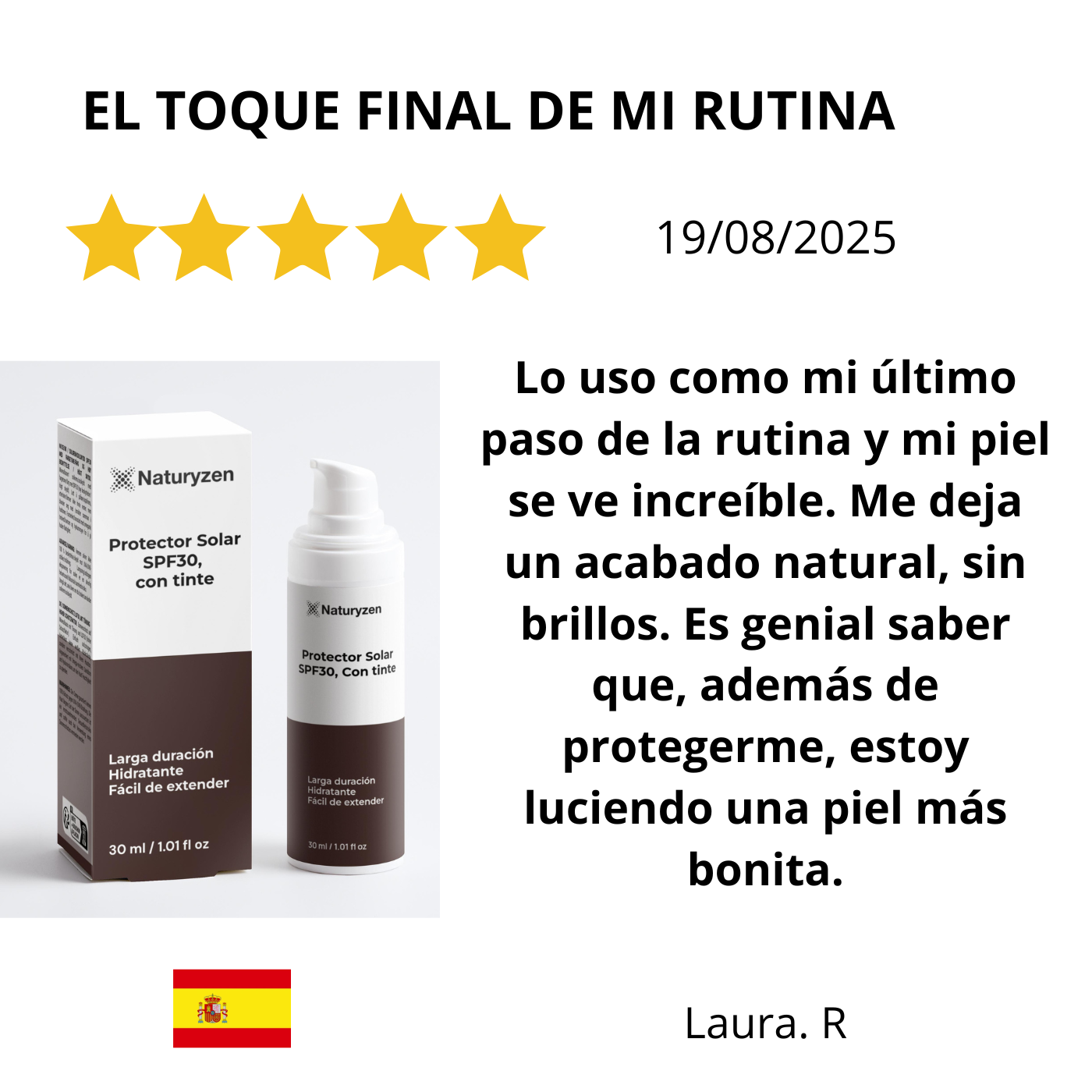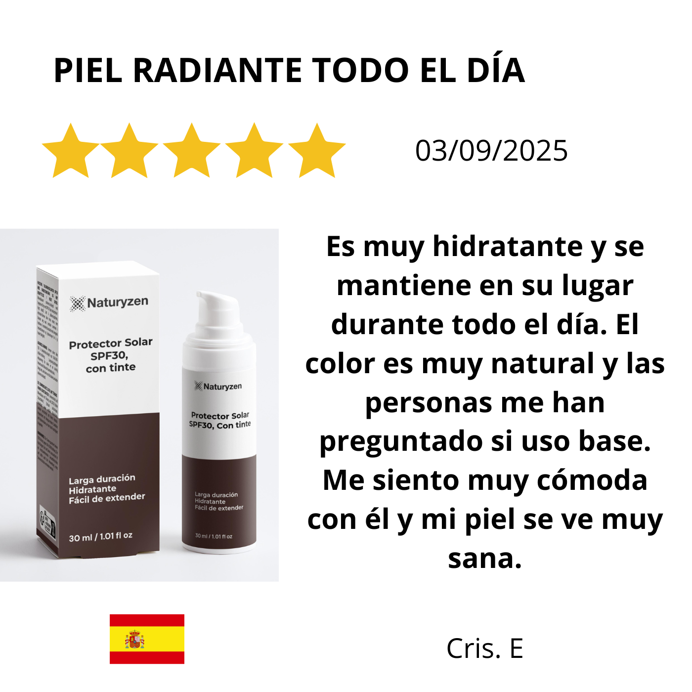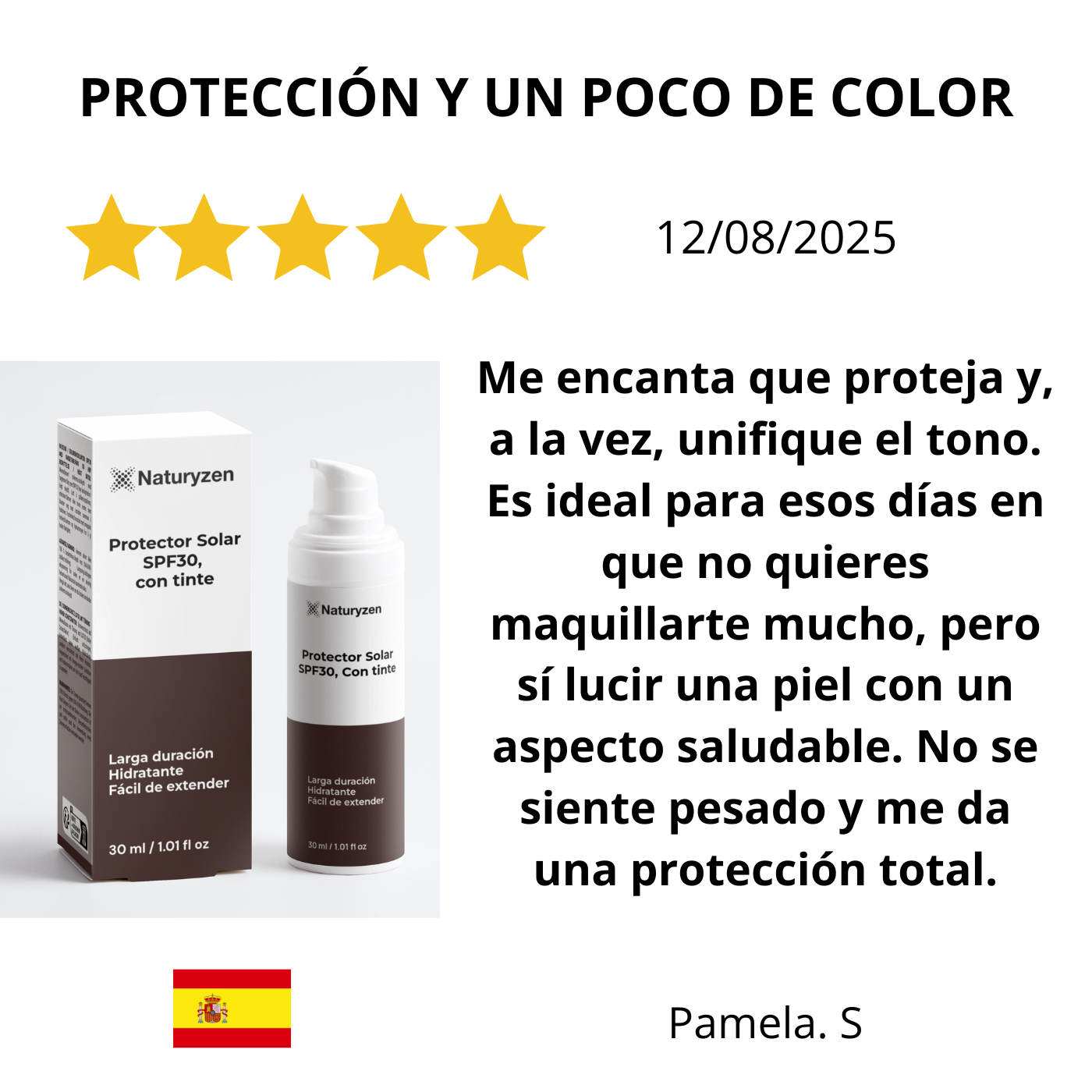 Este protector solar no solo cuida tu piel del sol, sino que también la embellece. Gracias a su ligero toque de color, se funde con tu tono de piel de forma natural, realzando tu bronceado y dándole un aspecto saludable y radiante. - Hidrata y protege: Su fórmula te ofrece una alta protección SPF30 contra los rayos UVA/UVB, y a la vez nutre tu piel para que la sientas cómoda y suave.